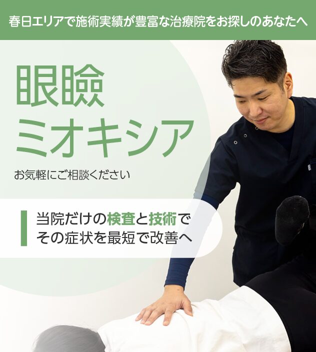 まぶたのピクピクが続く眼瞼ミオキミアは、目の使い過ぎや首・肩の緊張と関係することが多くみられます。首や肩の筋緊張、姿勢のバランス、眼精疲労の度合いを詳しく検査し、それぞれの負担を軽減する施術を行います。