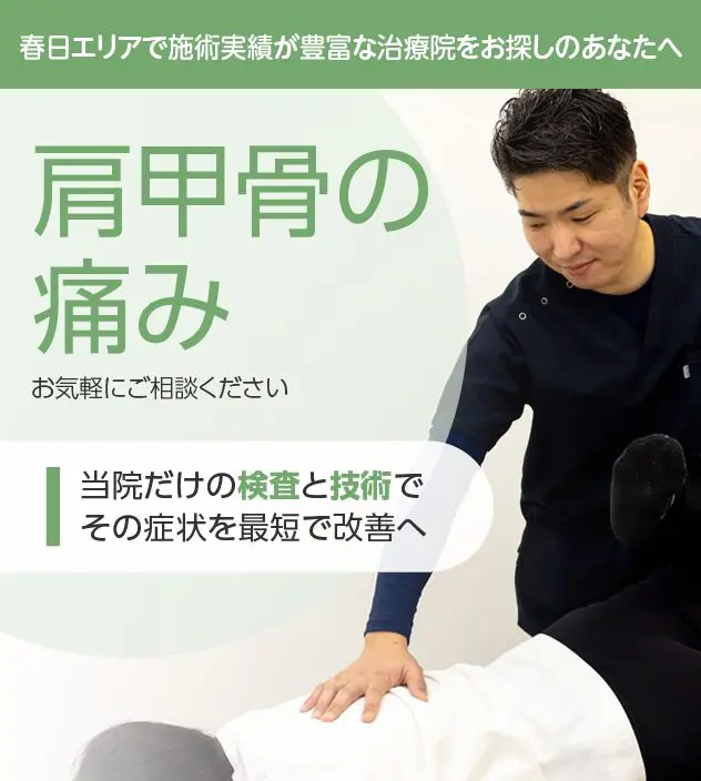 病院やほかの治療院で改善しなかったとしても諦める必要はありません。肩甲骨の痛みは豊富な施術実績を誇る当院にお任せください。